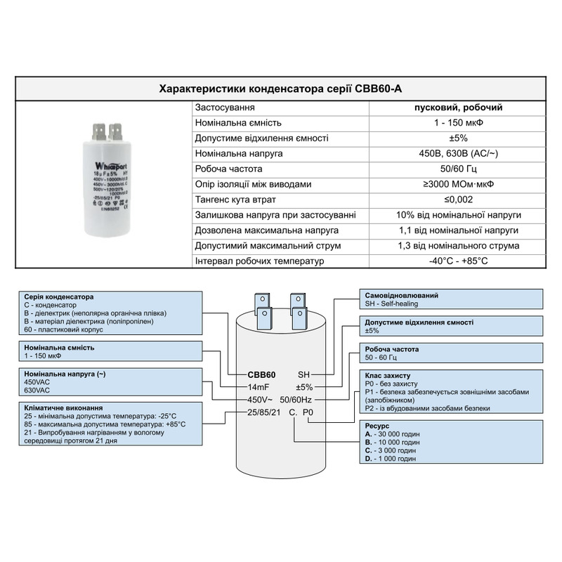 • серия - CBB60-A (C - конденсатор, B - диэлектрик - неполярная органическая пленка, B - материал