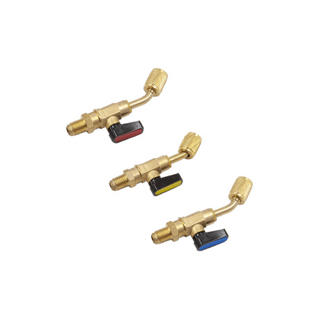 3 крана (ручки с красным, синим и желтым маркером). Для заправочного шланга. Угловые. Под фреон R-12, R-22, R-134a
